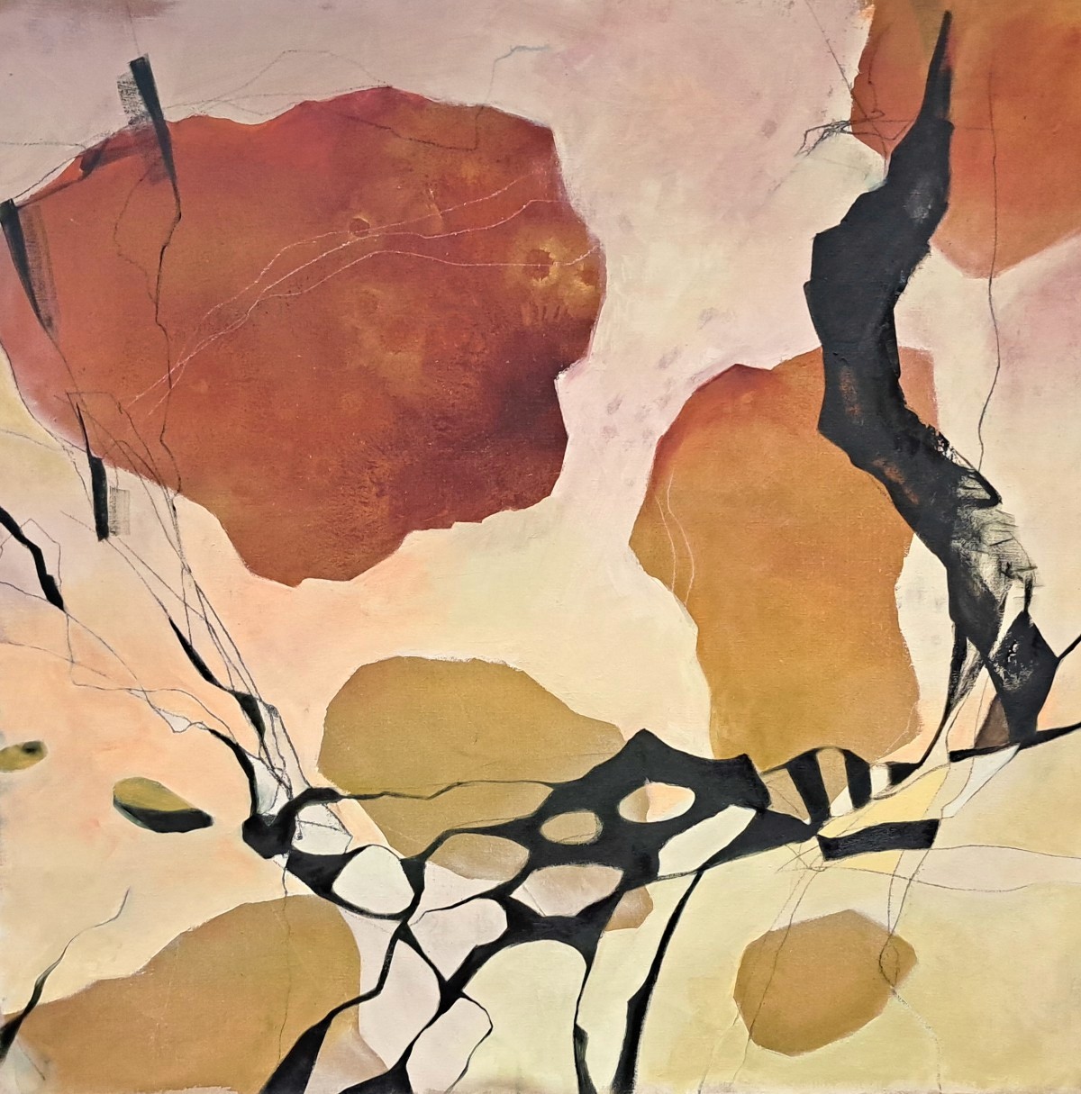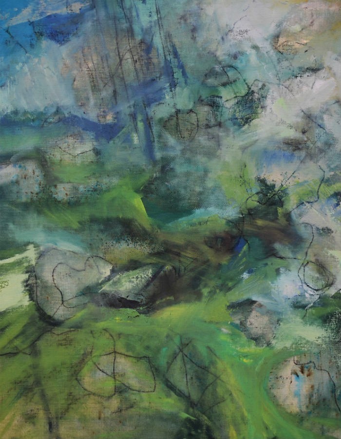 Het ruwe linnen blijft in elk doek zeker ergens zichtbaar. De basale uitstraling van het materiaal refereert naar de echtheid van de natuur, de lijnen en vlakken zijn als groeven of sporen in het landschap, als littekens in het oppervlak, de huid van de aarde.
